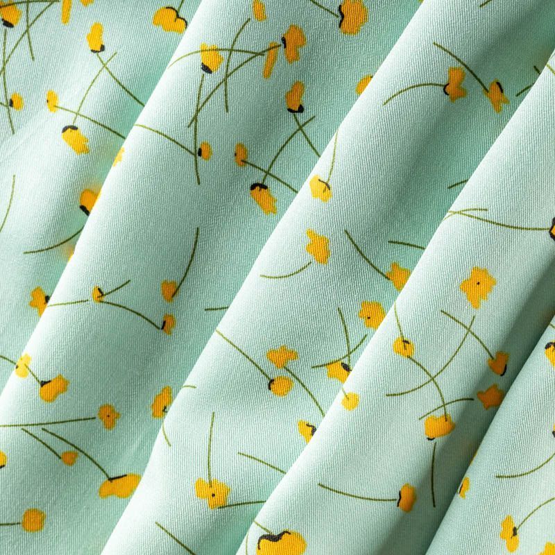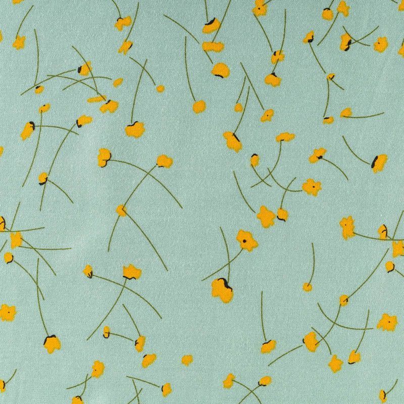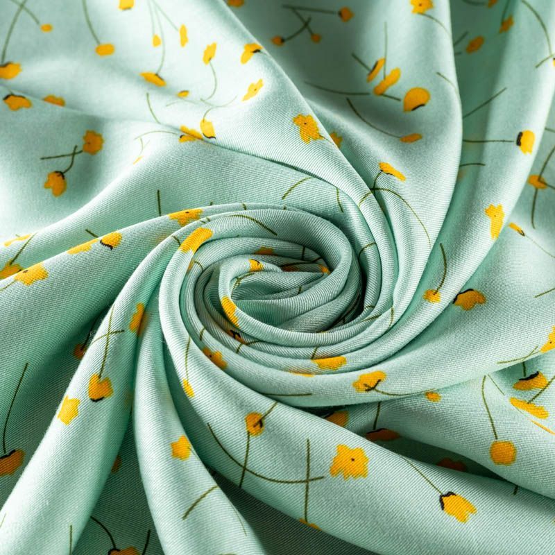 Качественный вискозный твил-штапель с милым принтом из мелких цветочков на пастельном мятно-зеленом фоне. Мягкая ткань средней плотности, имеет саржевое плетение и характерный диагональный рубчик на поверхности. Хорошо сохраняет форму, не сильно мнется и не деформируется в процессе эксплуатации.  Красиво ложится в складки, поэтому прекрасно подойдет на длинные драпированные юбки и платья, туники, на свободные брюки или шорты, топы.