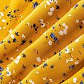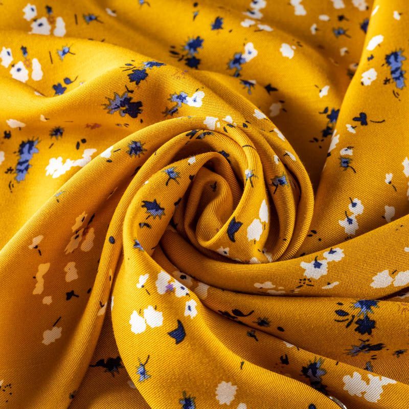 Качественный вискозный твил-штапель с нежным принтом из мелких цветочков белого и синего оттенков на фоне цвета шафрана. Мягкая ткань средней плотности, имеет саржевое плетение и характерный диагональный рубчик на поверхности. Хорошо сохраняет форму, не сильно мнется и не деформируется в процессе эксплуатации.  Красиво ложится в складки, поэтому прекрасно подойдет на длинные драпированные юбки и платья, туники, на свободные брюки или шорты, топы.