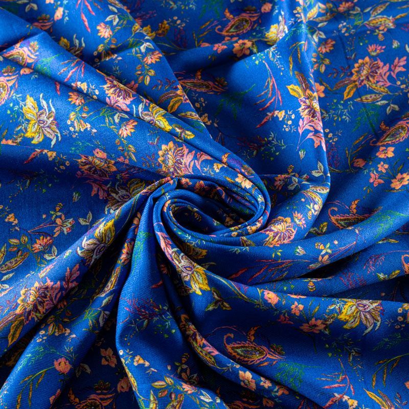 Итальянский твил-штапель с цветочным принтом на васильковом фоне. Плотная и мягкая ткань, имеет саржевое плетение и характерный диагональный рубчик на поверхности. Отлично сохраняет форму, не сильно мнется и не деформируется в процессе эксплуатации.  Красиво ложиться в складки, поэтому прекрасно подойдет на длинные драпированные юбки и платья, на свободные брюки или шорты, топы.