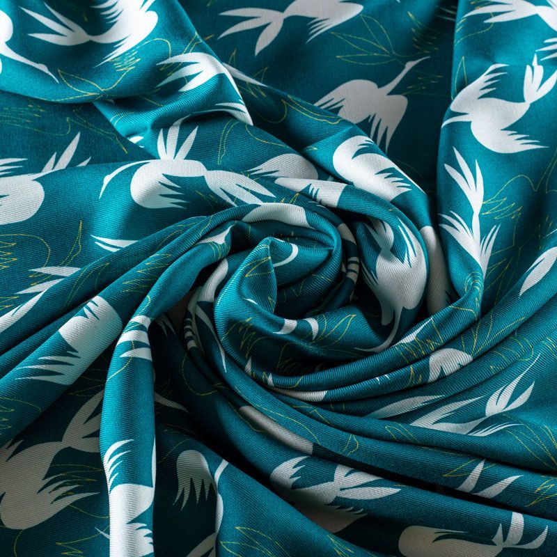 Итальянский вискозный твил-штапель со стилизованным принтом в виде летящих птици темно-бирюзового оттенка. Мягкая ткань средней плотности, имеет саржевое плетение и характерный диагональный рубчик на поверхности. Хорошо сохраняет форму, не сильно мнется и не деформируется в процессе эксплуатации. Красиво ложится в складки, поэтому прекрасно подойдет на длинные драпированные юбки и платья, туники, на свободные брюки или шорты, топы.