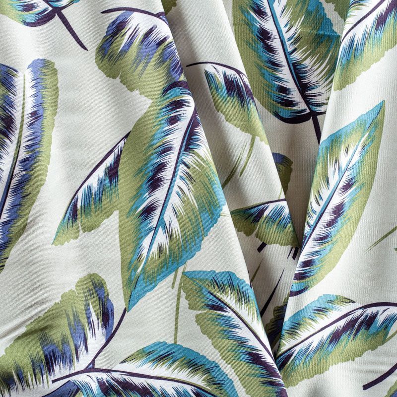 Качественный твил-штапель с крупным растительным принтом на спокойном фоне. Мягкая ткань средней плотности, имеет саржевое плетение и характерный диагональный рубчик на поверхности. Хорошо сохраняет форму, не сильно мнется и не деформируется в процессе эксплуатации. Красиво ложится в складки, поэтому прекрасно подойдет на длинные драпированные юбки и платья, на свободные брюки или шорты, топы.