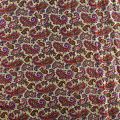 Плотная и мягкая ткань фисташкового цвета с цветным узором пейсли, имеет саржевое плетение и характерный диагональный рубчик на поверхности. Отлично сохраняет форму, не сильно мнется и не деформируется в процессе эксплуатации. Красиво ложится в складки, поэтому прекрасно подойдет на длинные драпированные юбки и платья, на свободные брюки или шорты, топы.