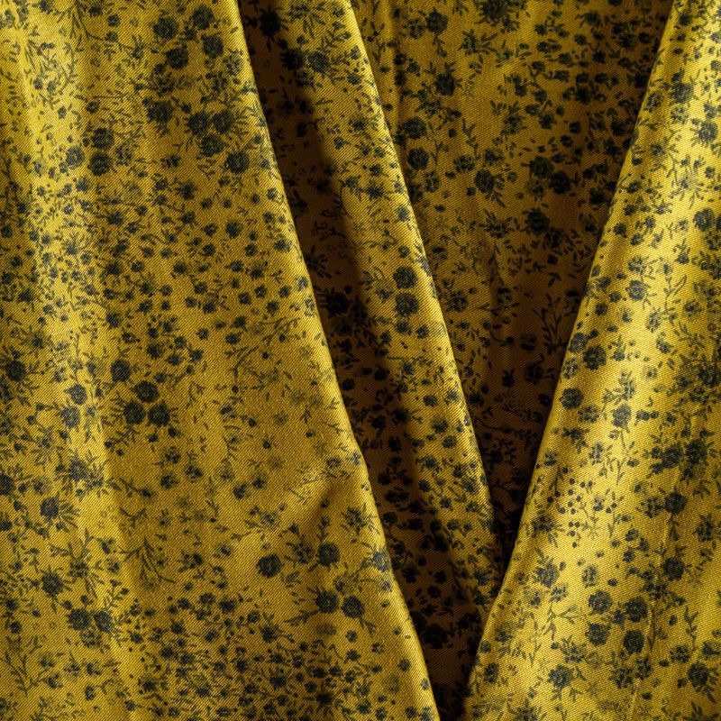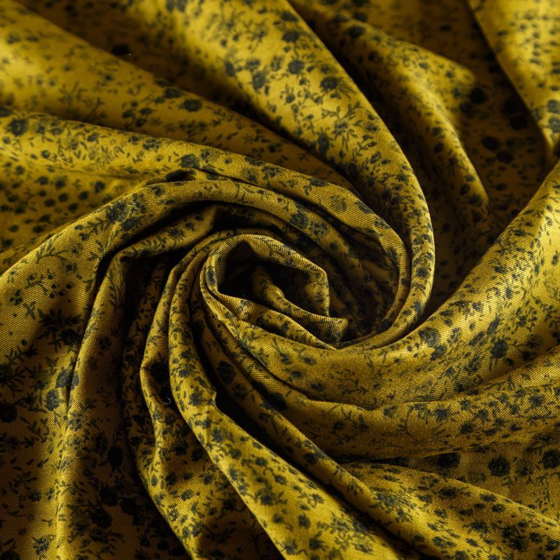 Плотная и мягкая ткань желто-зеленого оттенка с монохромным мелкоцветом, имеет саржевое плетение и характерный диагональный рубчик на поверхности. Отлично сохраняет форму, не сильно мнется и не деформируется в процессе эксплуатации. Красиво ложится в складки, поэтому прекрасно подойдет на длинные драпированные юбки и платья, на свободные брюки или шорты, топы.
