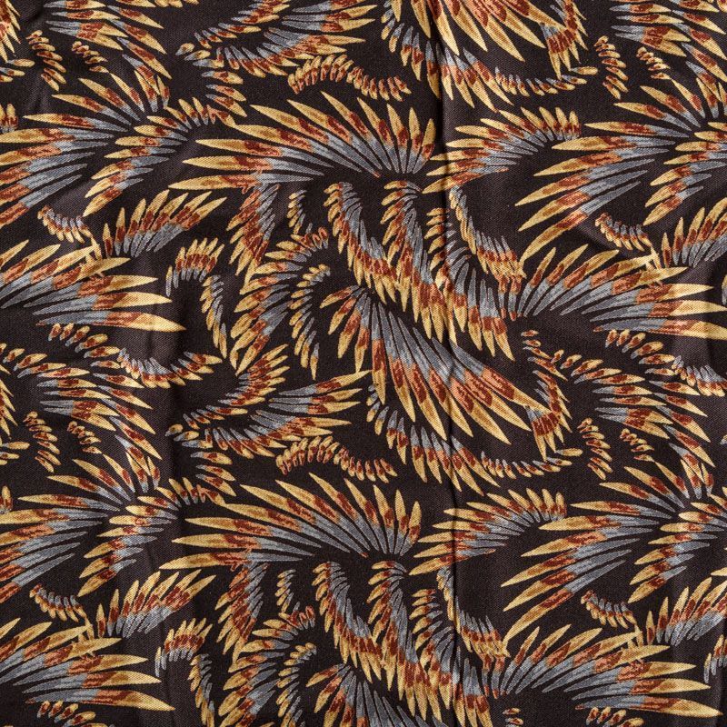 Плотная и мягкая ткань черного цвета с фантазийным принтом, имеет саржевое плетение и характерный диагональный рубчик на поверхности. Отлично сохраняет форму, не сильно мнется и не деформируется в процессе эксплуатации. Красиво ложится в складки, поэтому прекрасно подойдет на длинные драпированные юбки и платья, на свободные брюки или шорты, топы.