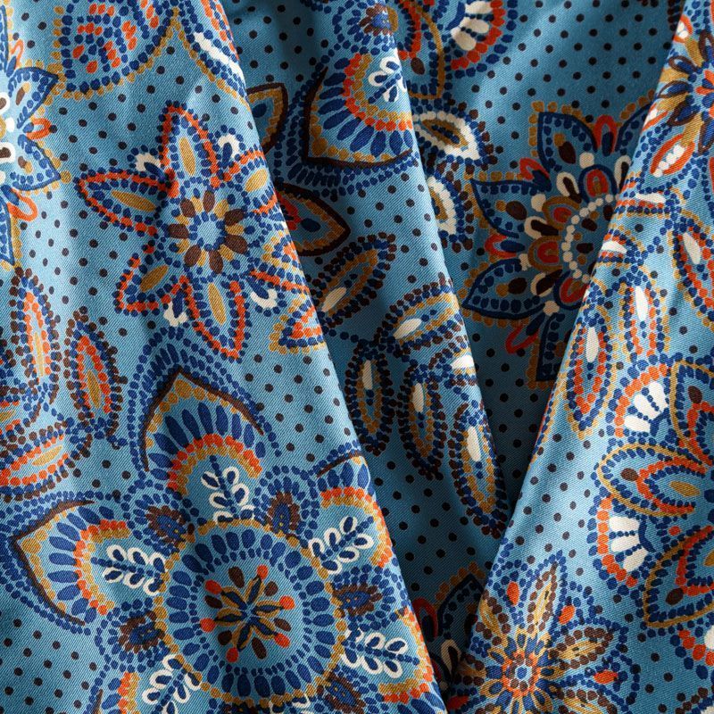 Плотная и мягкая ткань голубого оттенка со стилизованным цветочным орнаментом, имеет саржевое плетение и характерный диагональный рубчик на поверхности. Отлично сохраняет форму, не сильно мнется и не деформируется в процессе эксплуатации. Красиво ложится в складки, поэтому прекрасно подойдет на длинные драпированные юбки и платья, на свободные брюки или шорты, топы.