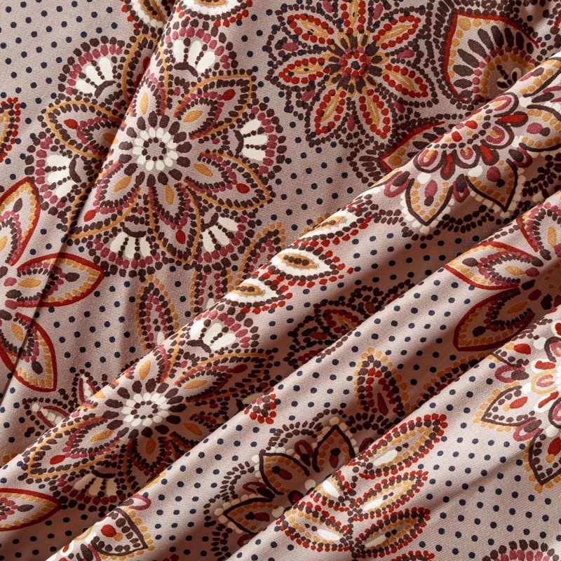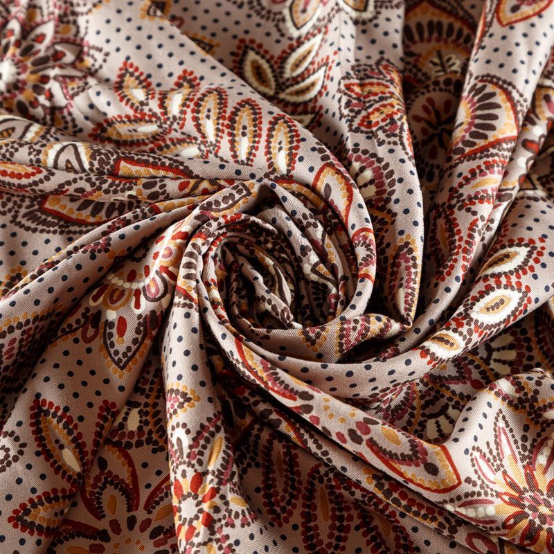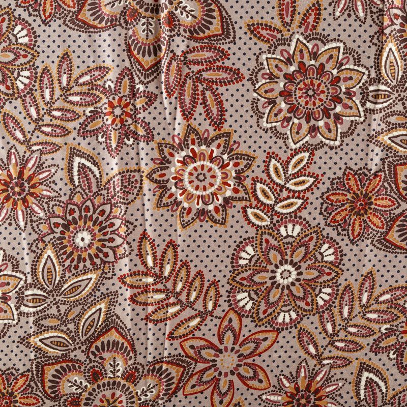 Плотная и мягкая ткань бежевого оттенка со стилизованным цветочным орнаментом, имеет саржевое плетение и характерный диагональный рубчик на поверхности. Отлично сохраняет форму, не сильно мнется и не деформируется в процессе эксплуатации. Красиво ложится в складки, поэтому прекрасно подойдет на длинные драпированные юбки и платья, на свободные брюки или шорты, топы.