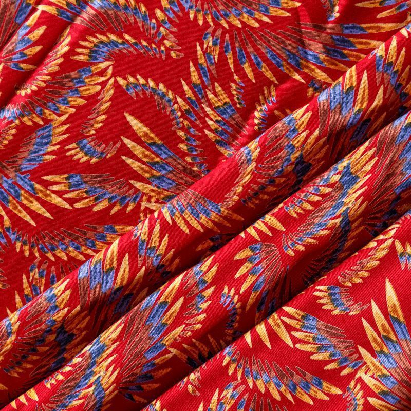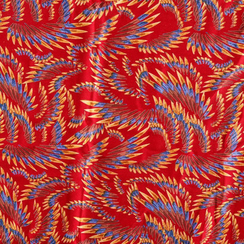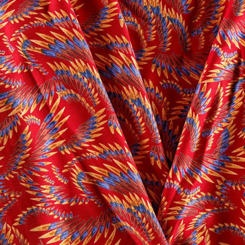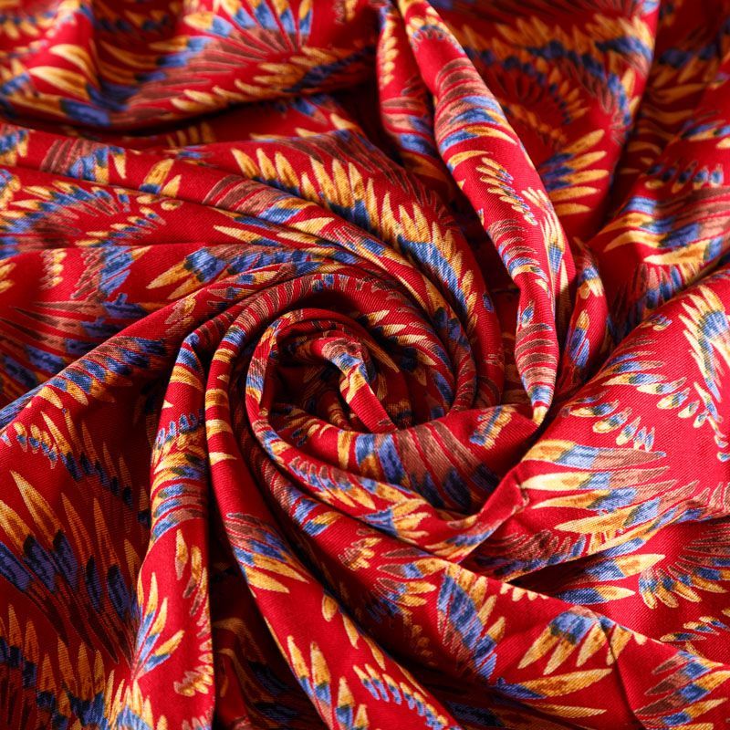 Плотная и мягкая ткань темно-красного оттенка с фантазийным принтом, имеет саржевое плетение и характерный диагональный рубчик на поверхности. Отлично сохраняет форму, не сильно мнется и не деформируется в процессе эксплуатации. Красиво ложится в складки, поэтому прекрасно подойдет на длинные драпированные юбки и платья, на свободные брюки или шорты, топы.