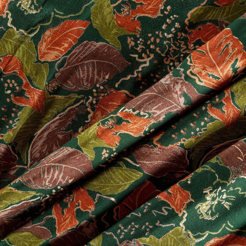 Плотная и мягкая ткань темно-зеленого цвета с растительным принтом в осенних оттенках, имеет саржевое плетение и характерный диагональный рубчик на поверхности. Отлично сохраняет форму, не сильно мнется и не деформируется в процессе эксплуатации. Красиво ложится в складки, поэтому прекрасно подойдет на длинные драпированные юбки и платья, на свободные брюки или шорты, топы, комбинезоны, а также для домашней одежды.