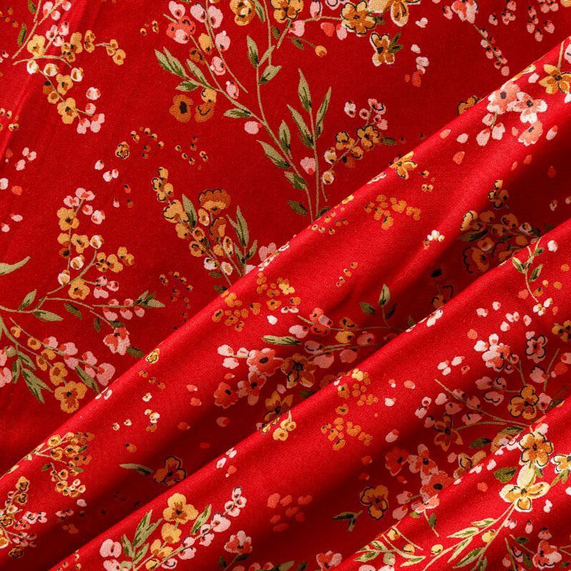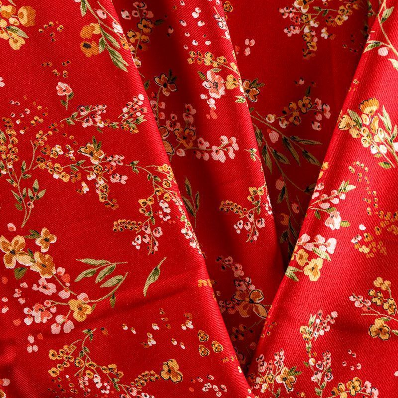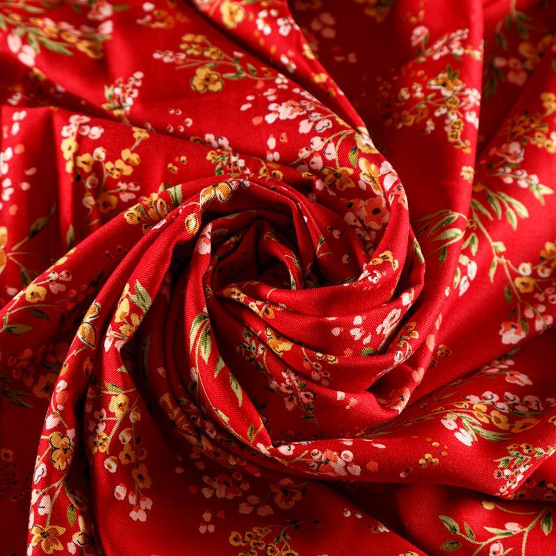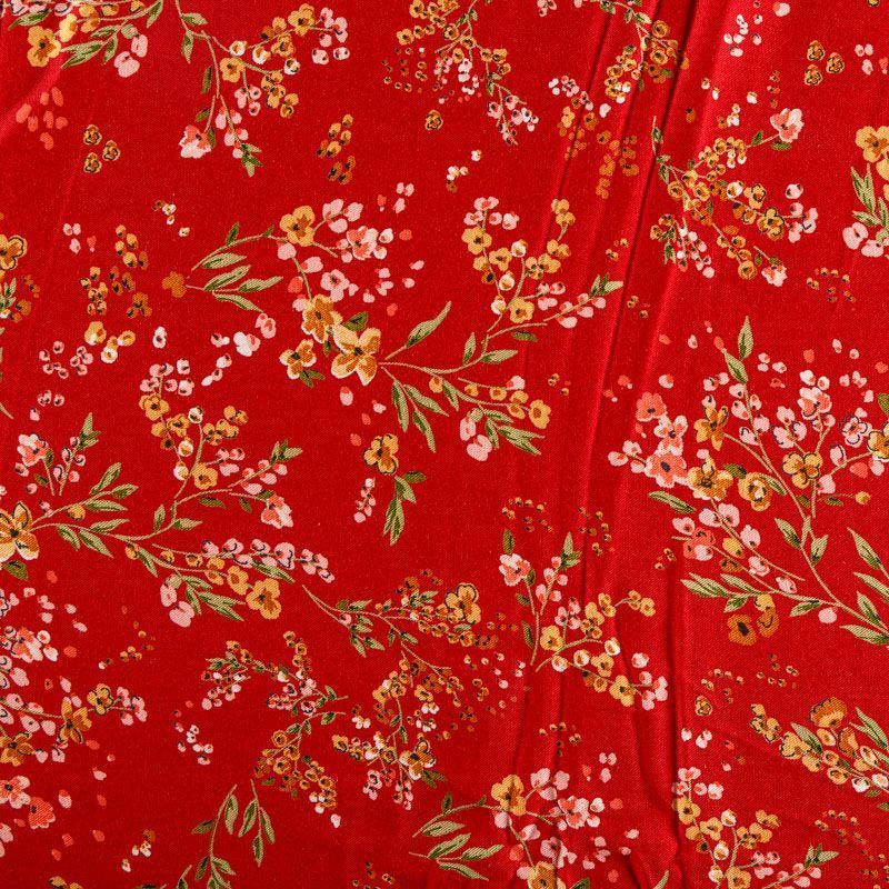 Плотная и мягкая ткань вишневого оттенка с ярким мелкоцветом, имеет саржевое плетение и характерный диагональный рубчик на поверхности. Отлично сохраняет форму, не сильно мнется и не деформируется в процессе эксплуатации. Красиво ложится в складки, поэтому прекрасно подойдет на длинные драпированные юбки и платья, на свободные брюки или шорты, топы, комбинезоны, а также для домашней одежды.