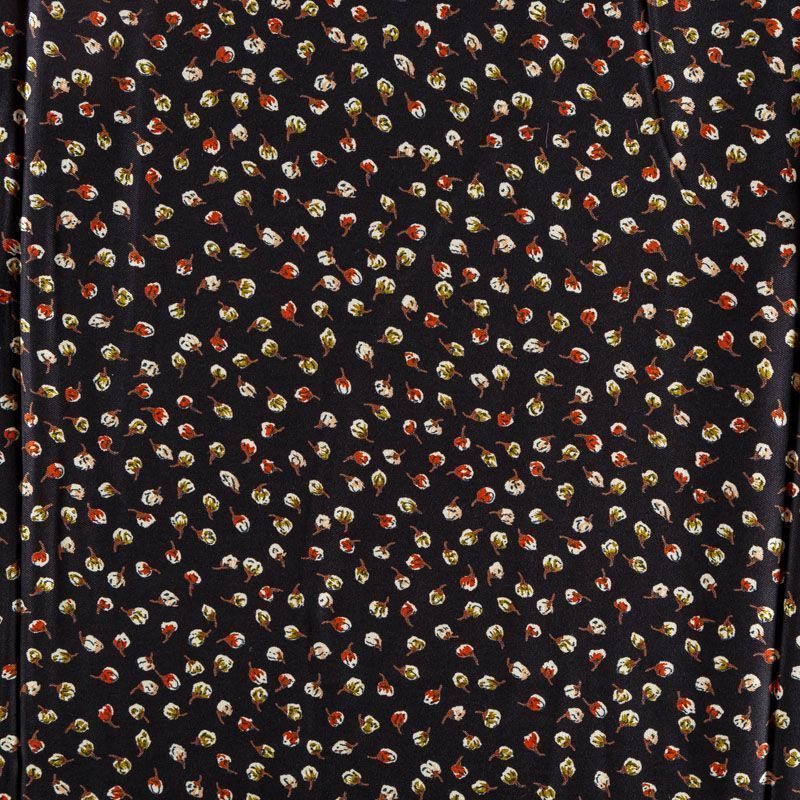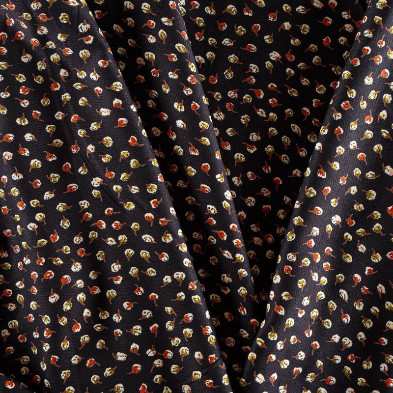 Плотная и мягкая ткань черного цвета с ярким мелкоцветом, имеет саржевое плетение и характерный диагональный рубчик на поверхности. Отлично сохраняет форму, не сильно мнется и не деформируется в процессе эксплуатации. Красиво ложится в складки, поэтому прекрасно подойдет на длинные драпированные юбки и платья, на свободные брюки или шорты, топы, комбинезоны, а также для домашней одежды.