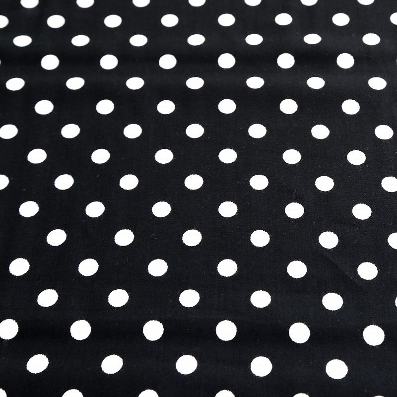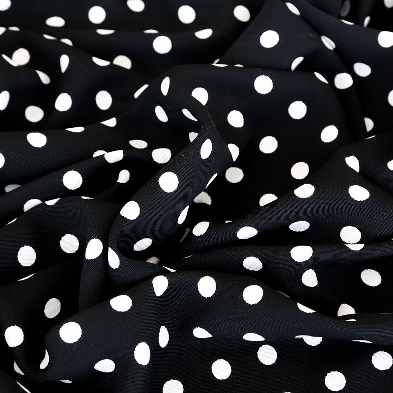 Плотная и мягкая ткань, имеет саржеве плетение и характерный диагональный рубчик на поверхности. Отлично сохраняет форму, не сильно мнется и не деформируется в процессе эксплуатации.  Красиво ложиться в складки, поэтому прекрасно подойдет на длинные драпированные юбки и платья, на свободные брюки или шорты, топы. Размер гороха 1см