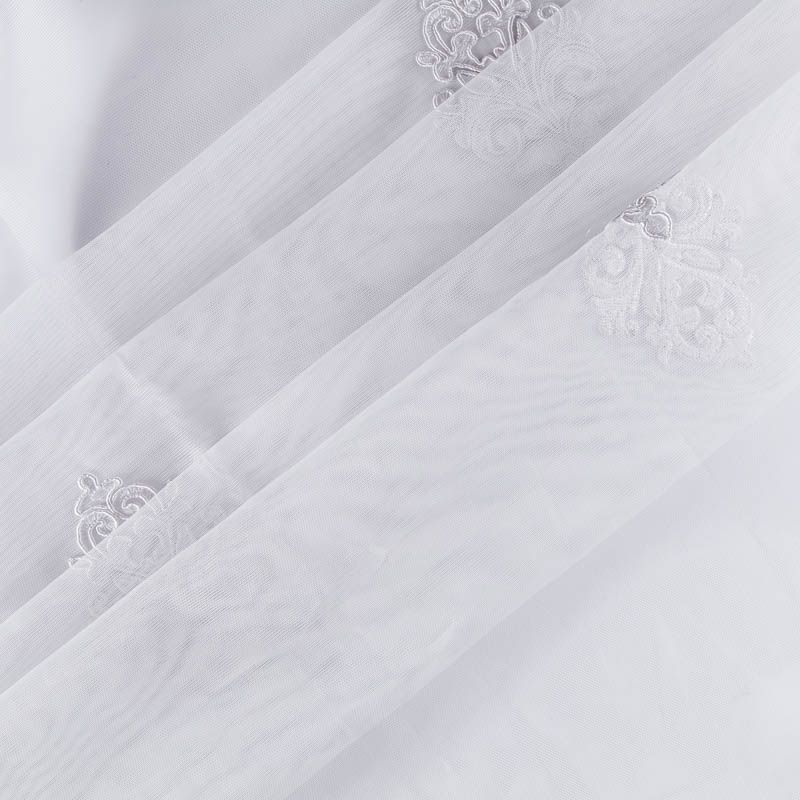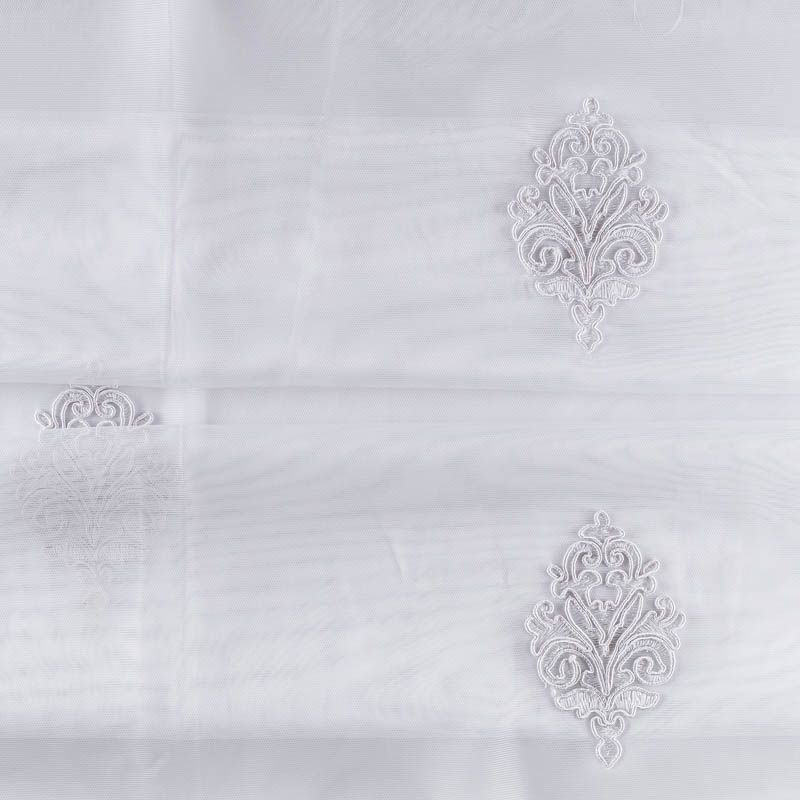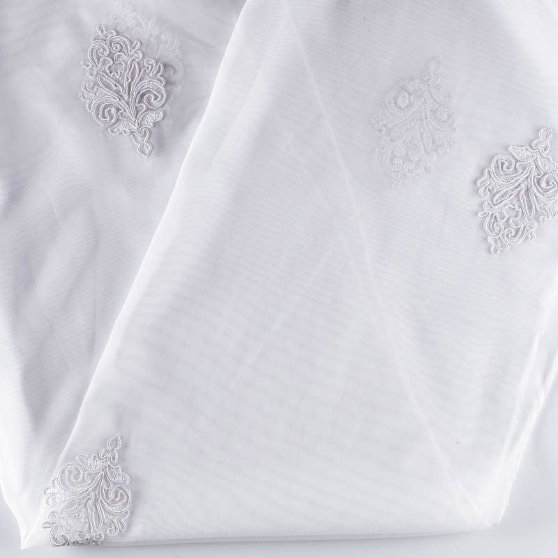 Сетка с вышивкой – это роскошный элемент дизайна, который преобразит любое помещение. Она отлично пропускает воздух, поэтому быстро сохнет после стирки. Прочная, ткань прослужит долго. Выдерживает большое количество стирок. Легкая, фактура ткани практически невесома, поэтому можно не опасаясь крепить ее даже на самый тонкий карниз. Сутажная элегантная вышивка в тон тюля в виде "дамасков" расположена по всей высоте ткани, нижний край украшен вышитым фестоном, без утяжелителя, фигурный.