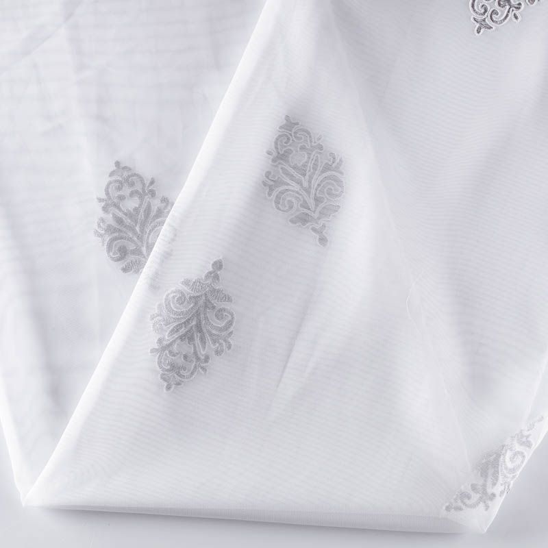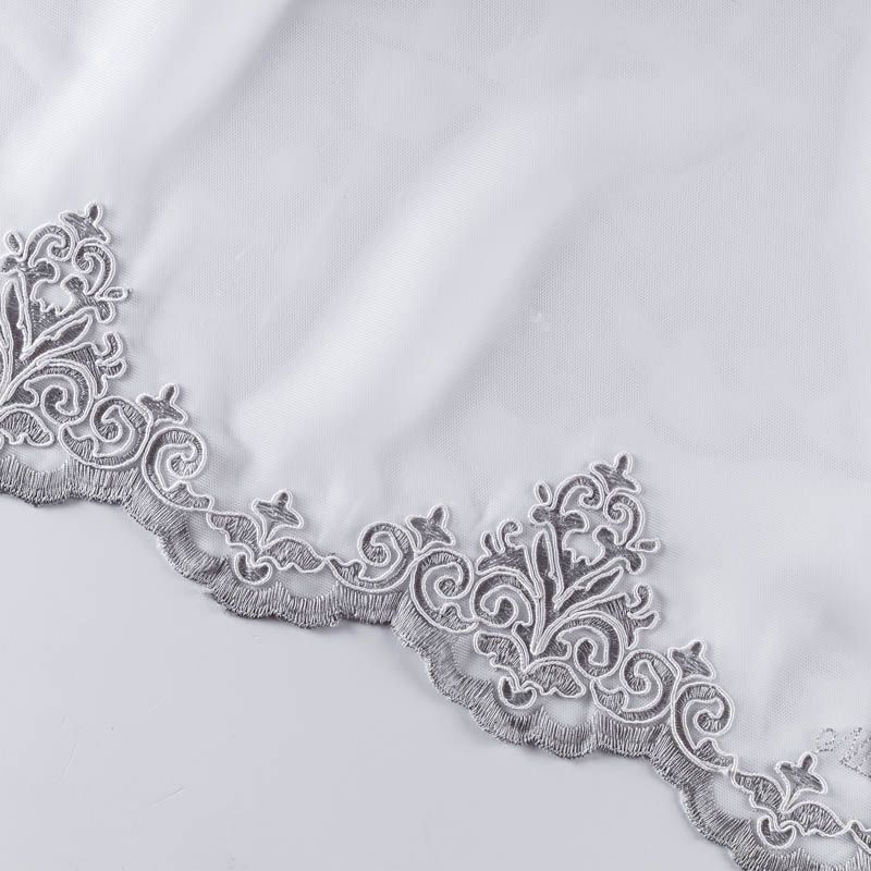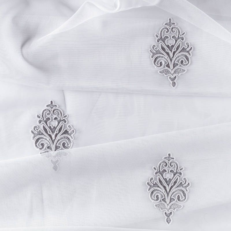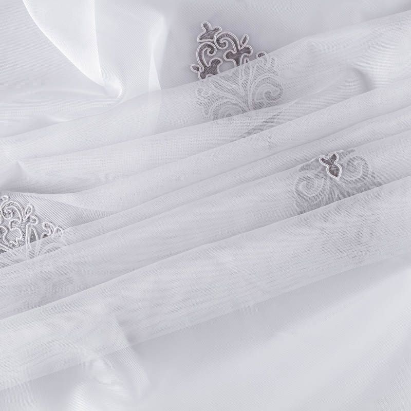Сетка с вышивкой – это роскошный элемент дизайна, который преобразит любое помещение. Она отлично пропускает воздух, поэтому быстро сохнет после стирки. Прочная, ткань прослужит долго. Выдерживает большое количество стирок. Легкая, фактура ткани практически невесома, поэтому можно не опасаясь крепить ее даже на самый тонкий карниз. Сутажная элегантная вышивка серебристо-серого цвета в виде "дамасков" расположена по всей высоте ткани, нижний край украшен вышитым фестоном, без утяжелителя, фигурный.