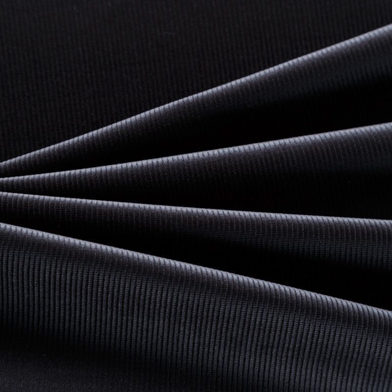 Итальянский костюмно-плательный вельвет из хлопка в черном оттенке. Очень приятный тактильно, поверхность бархатистая, рубчик средней ширины, тянется за счет эластана в составе, не просвечивает. Подойдет для пошива костюма, платья, юбки, брюк, верхней одежды.