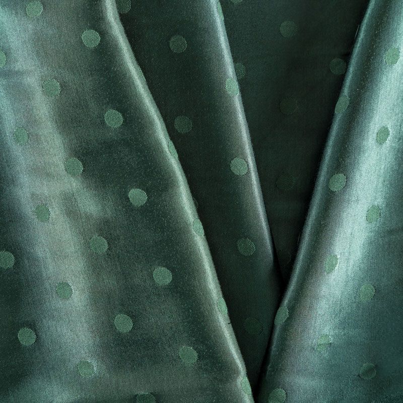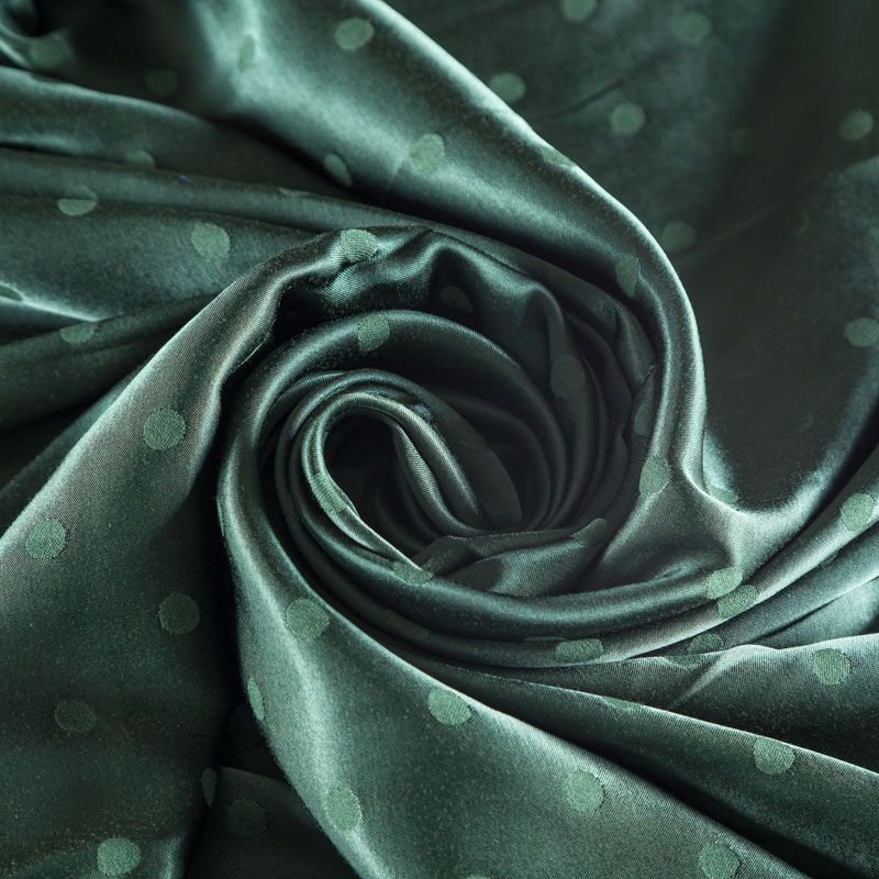 Атласная жаккардовая вискоза холодного темно-зеленого оттенка. Ткань плотная, но пластичная, хорошо драпируется и струится. Поверхность ткани гладкая, атласная, приятная на ощупь. Подойдет для пошива платья, сарафана, топа, блузки, рубашки, юбки, костюма в пижамном стиле, брюк свободного кроя, а также как подклад для верхней одежды.