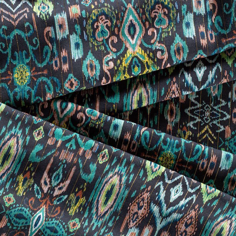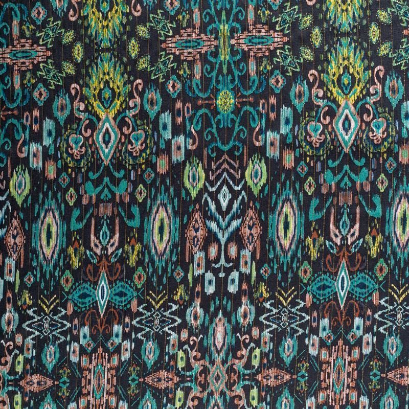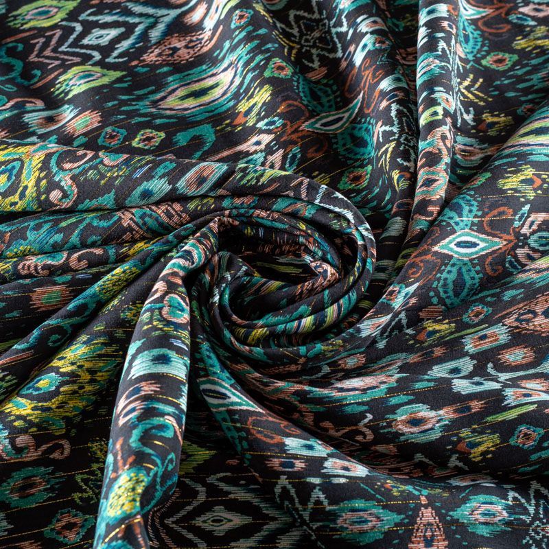 Итальянская плательно-блузочная вискоза со сложным этническим мотивом на черном фоне декорирована тонкой люрексовой нитью. Ткань очень пластичная, отлично драпируется и струится, мягкая и приятная на ощупь, не просвечивает. Прекрасно подойдет для пошива платья, топа, блузки, юбки.