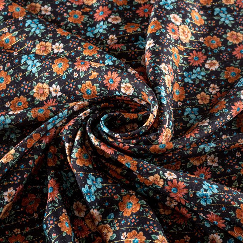 Итальянская плательно-блузочная вискоза с ярким цветочным принтом на черном фоне декорирована тонкой люрексовой полоской. Ткань очень пластичная, отлично драпируется и струится, мягкая и приятная на ощупь, не просвечивает. Прекрасно подойдет для пошива платья, топа, блузки, юбки.