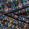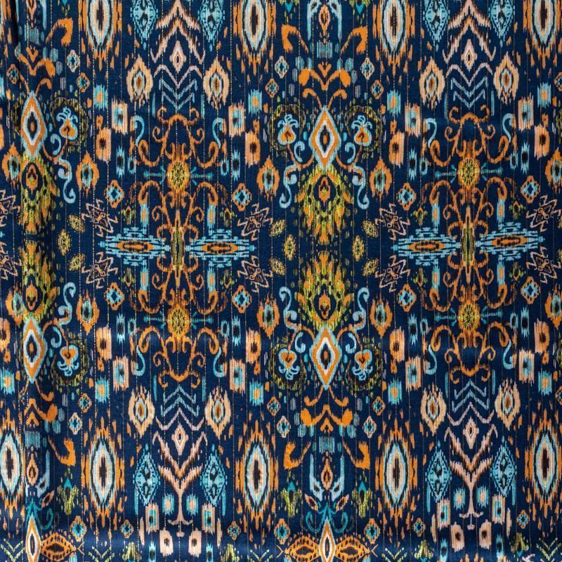 Итальянская плательно-блузочная вискоза со сложным этническим мотивом на синем фоне декорирована тонкой люрексовой нитью. Ткань очень пластичная, отлично драпируется и струится, мягкая и приятная на ощупь, не просвечивает. Прекрасно подойдет для пошива платья, топа, блузки, юбки.