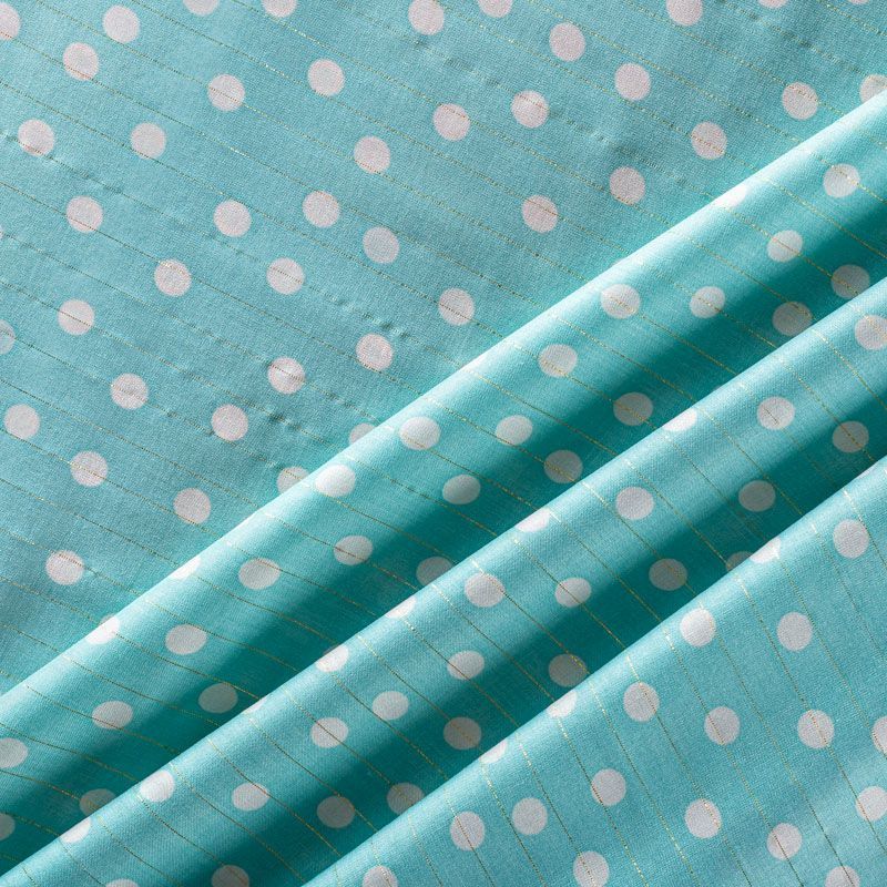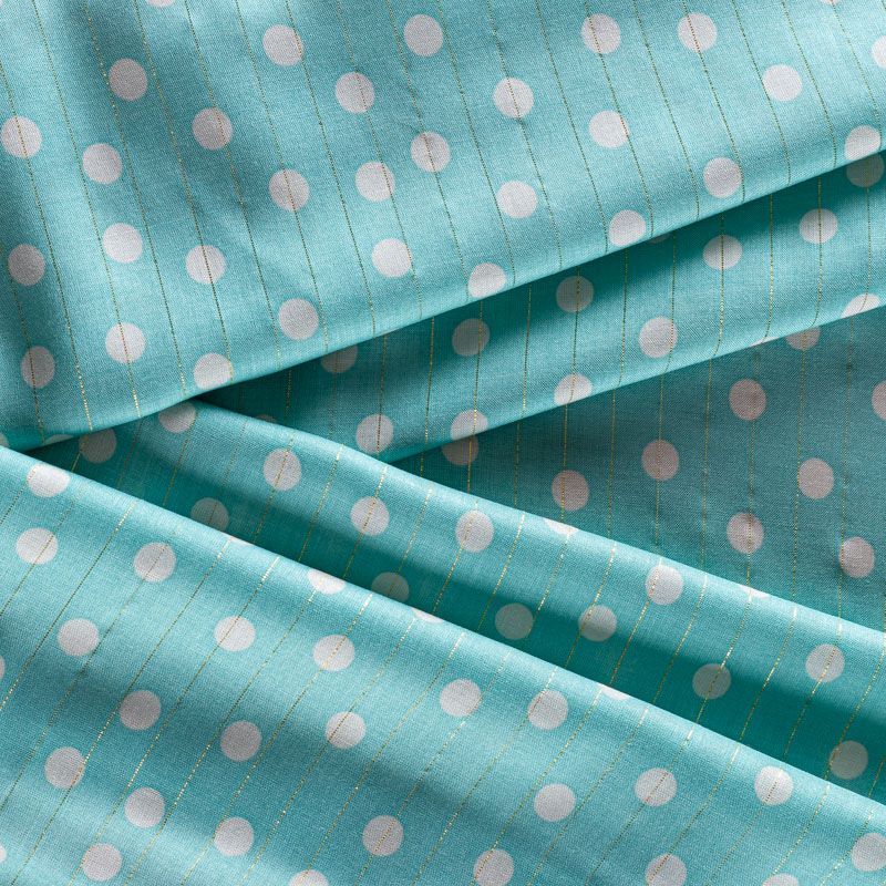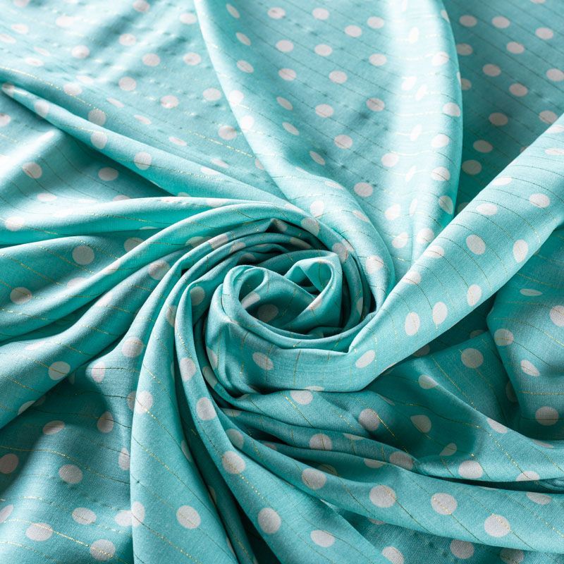 Итальянская плательно-блузочная вискоза в белый горох на мятно-бирюзовом фоне декорирована тонкой люрексовой нитью. Ткань очень пластичная, отлично драпируется и струится, мягкая и приятная на ощупь, не просвечивает. Прекрасно подойдет для пошива платья, топа, блузки, юбки.