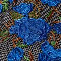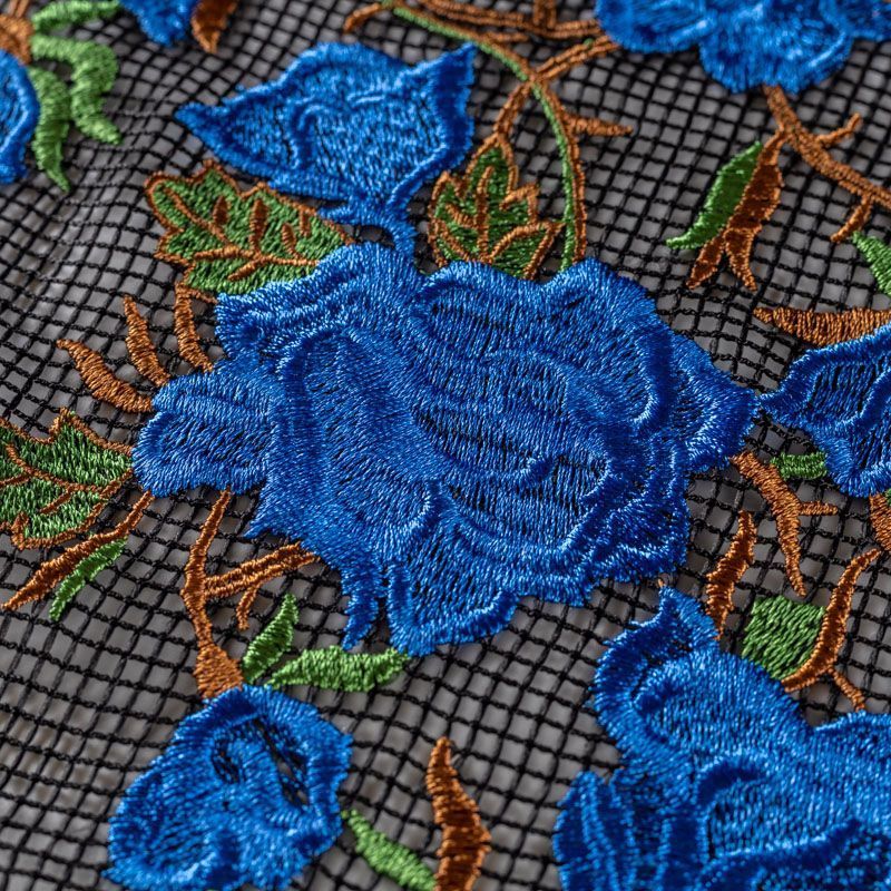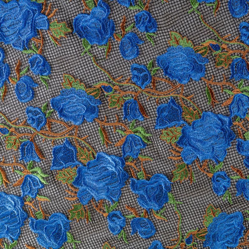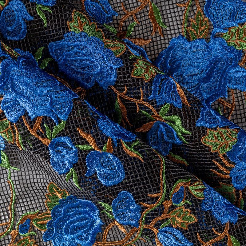 Шикарные розы василькового цвета, вышитые на чёрной сетке. Сетка имеет среднюю ячейку, за счет структуры немного тянется. Прекрасно подойдёт для платьев, юбок, брюк, шорт, топов, комбинированных платьев или отделки моделей одежды как для особых случаев, так на отдыхе. Рекомендуется подклад.