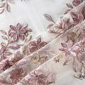 3D вышивка на сетке телесного оттенка. Мягкая, пластичная сетка украшена объемным флористическим узором в розово-зеленых тонах. Цвет сам по себе очень нежный, но если сложить ткань в несколько слоев, тон становится более насыщенным. Полотно легкое, воздушное, матовое. Идеален для вечерних нарядов, платьев на выпускной бал, бальных костюмов, пышных юбок-пачек, а также блузок.