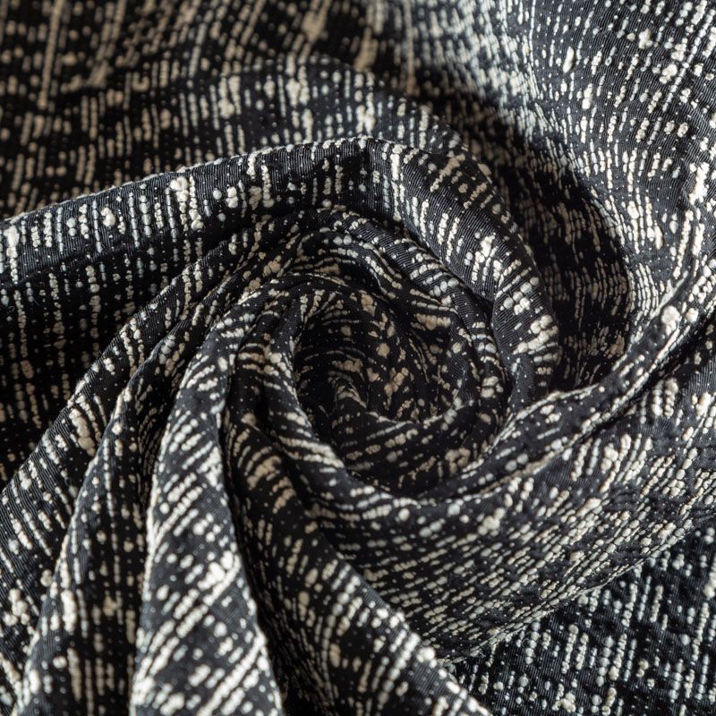 Итальяский плотный, но пластичный и не жесткий жаккард с хлопкоом, напоминающий гобелен черного цвета с добавлением нитей молочного оттенка. Ткань достаточно фактурная, держит форму, не просвечивает. Подойдет для пошива костюма, платьев-футляров в стиле Dior, жакетов, легких пальто, бомберов, юбок, брюк-палацио или шорт.