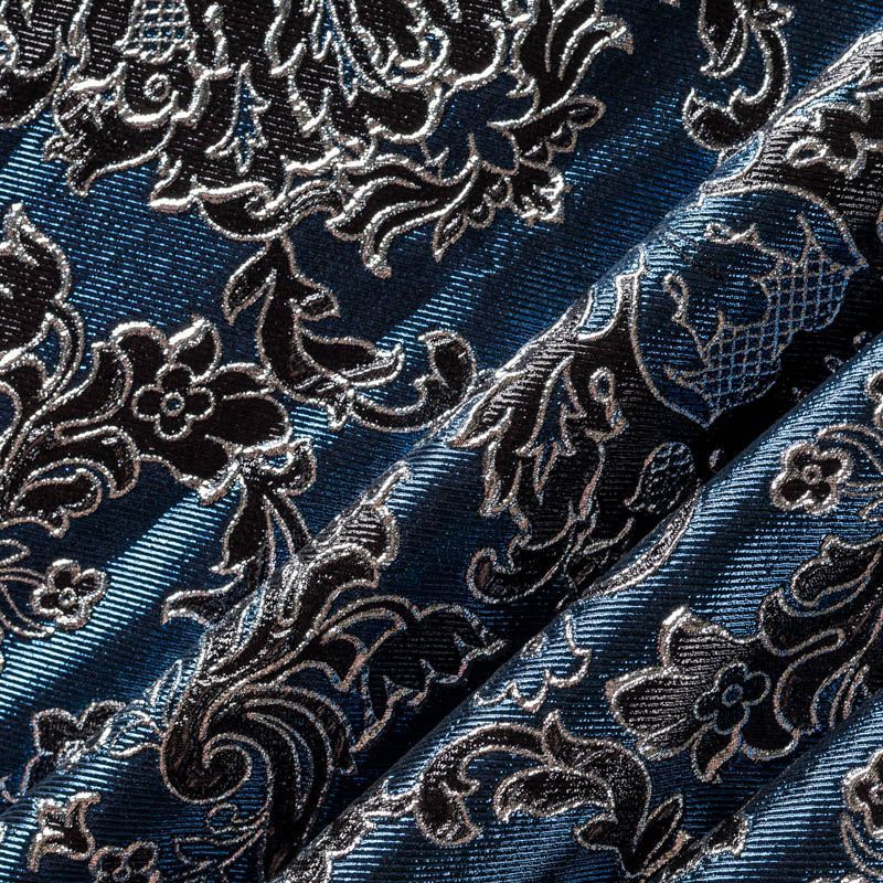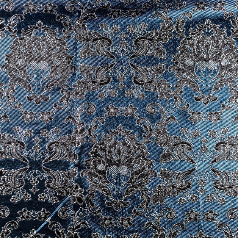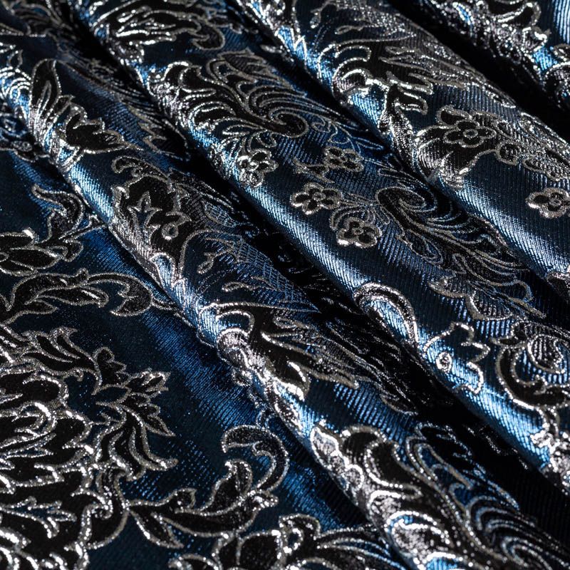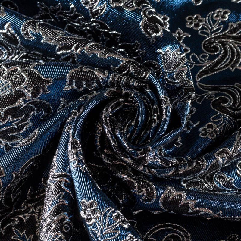 Итальянский жаккард с рельефным металлизированным рисунком. Принт является двухсторонним, поэтому возможно использование материала с двух сторон. Ткань жесткая, плотная, но легкая, дает возможность создавать пышные силуэты, объёмные драпировки. Применяется для пошива нарядной и вечерней одежды.